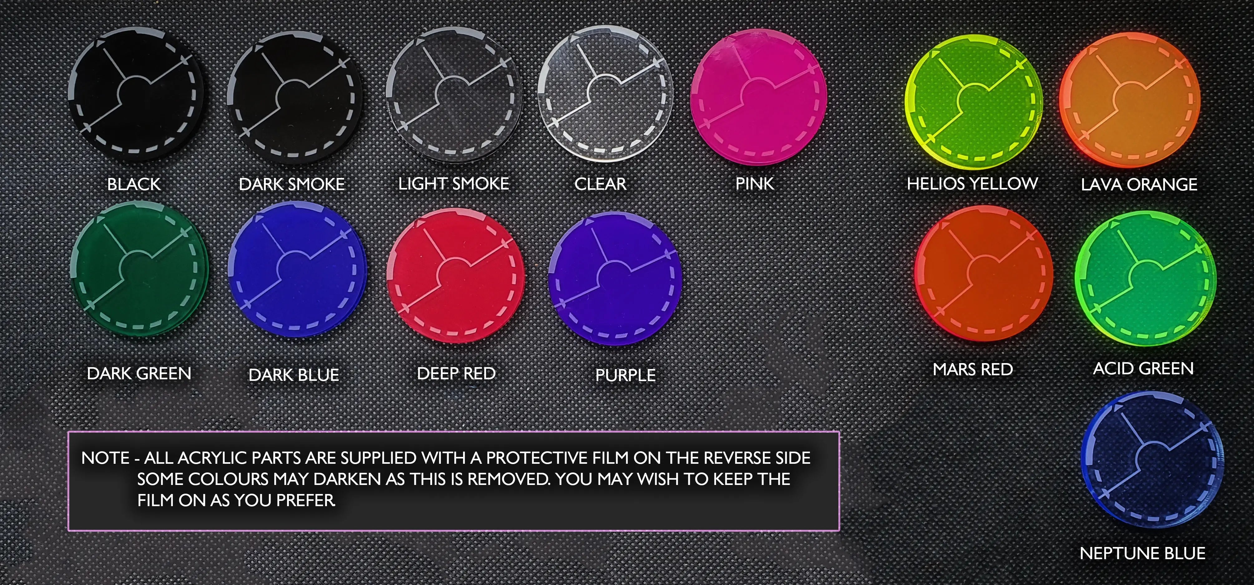 Our laser cut tokens, templates and widgets made from acrylic plastic are usually supplied with a protective backing film on one or both sides. This is to protect any non-etched faces from scratches in transit and should be removed after delivery.